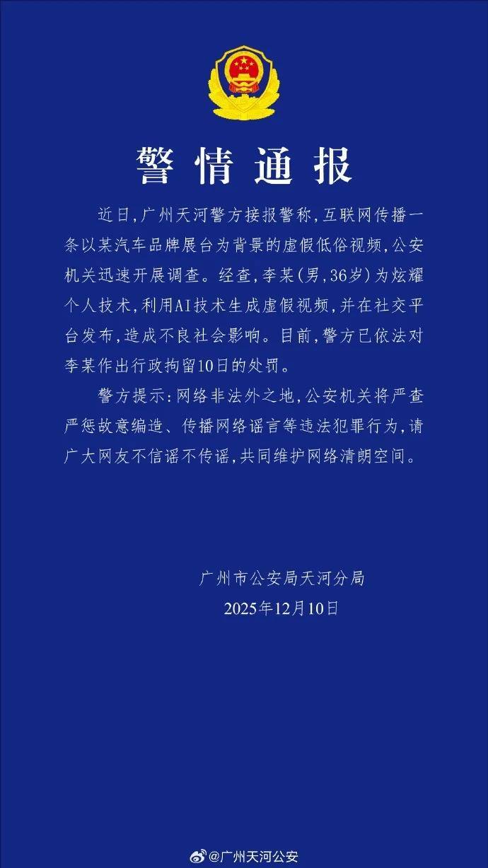 近日,广州河汉警方接报警称,互联网传播一条以某汽车品牌展台为布景的失误低俗视频,公安机关飞速开展访问。经查,李某(男,36岁)为娇傲个东说念主工夫,运用AI工夫生成失误视频,并在酬酢平台发布,酿成不良社会影响。当今,警方已照章对李某作出行政拘留10日的科罚。