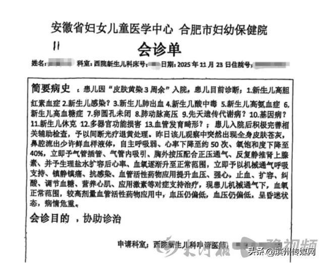 陈先生先容,孩子于2025年10月27日在合肥市妇幼保健院西区剖宫产出身,出死后因黄疸未退,于11月20日到该院更生儿科入院,禁受蓝光调理。由于更生儿科扩充阻塞处罚,不允许家属陪护,仅每周一、三、五通过电话见知孩子情况。21日,病院电话见知孩子一切平日,黄疸值虽有反弹但无需担忧。